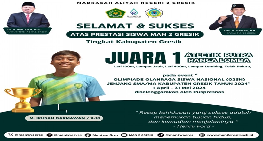 Gresik, 1 Juni 2024 - Prestasi gemilang kembali diraih oleh siswa Madrasah Aliyah Negeri 2 (MAN 2) Gresik. Muhammad Ikhsan Darmawan, siswa berprestasi dari sekolah tersebut, berhasil meraih Juara 1 dalam cabang olahraga panca lomba (lari 100 m, lompat jauh, lari 400m, lempar lembing, tolak peluru) atletik putra pada Olimpiade Olahraga Siswa Nasional (O2SN) jenjang SMA/MA tingkat Kabupaten Gresik tahun 2024.