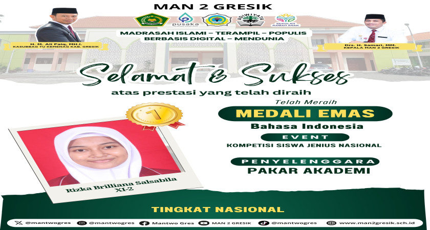 MAN 2 Gresik – Prestasi membanggakan kembali diraih oleh MAN 2 Gresik di kancah nasional. Kali ini, Rizka Brilliana Salsabila, siswi kelas XI-2, sukses meraih Medali Emas dalam bidang Bahasa Indonesia pada ajang Kompetisi Siswa Jenius Nasional yang diselenggarakan oleh Pakar Akademi.