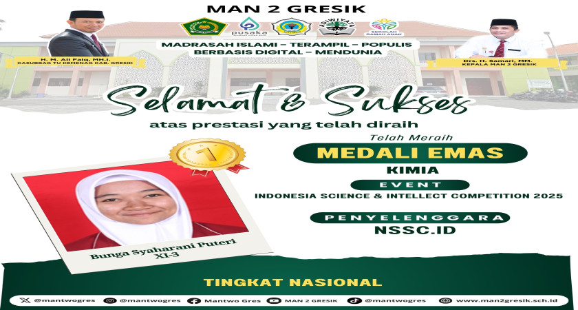 MAN 2 Gresik – Prestasi membanggakan kembali diraih oleh MAN 2 Gresik. Bunga Syaharani Puteri, siswi kelas XI-3, berhasil meraih Medali Emas pada bidang Kimia dalam ajang Indonesia Science & Intellect Competition 2025 tingkat nasional yang diselenggarakan oleh NSSC.ID.