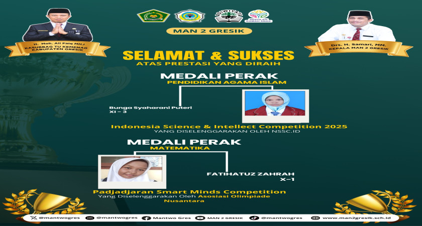 MAN 2 Gresik kembali menorehkan prestasi membanggakan di tingkat nasional. Dua siswi berhasil meraih medali perak pada ajang bergengsi yang diselenggarakan oleh lembaga kompetisi nasional.