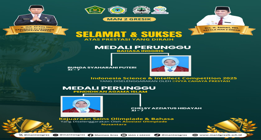 Prestasi kembali ditorehkan oleh siswi MAN 2 Gresik pada ajang olimpiade tingkat nasional. Kali ini, dua siswi dari kelas XI-7 berhasil mengharumkan nama madrasah dengan meraih medali perunggu dalam dua bidang kompetisi yang berbeda.