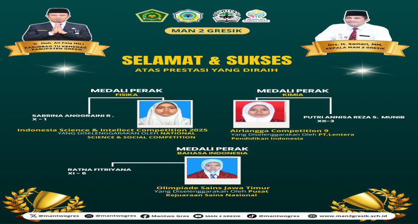 MAN 2 Gresik kembali menorehkan prestasi membanggakan di tingkat nasional maupun provinsi. Kali ini, tiga siswi berhasil meraih medali perak pada ajang olimpiade bergengsi di bidang bah