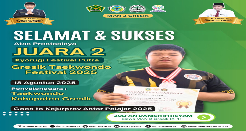 MAN 2 Gresik – Prestasi membanggakan kembali ditorehkan oleh siswa MAN 2 Gresik. Kali ini datang dari Zulfan Danish Ihtisyam, siswa kelas X-4, yang berhasil meraih Juara 2 Kyourgi Festival Putra pada ajang Gresik Taekwondo Festival 2025. Kompetisi ini diselenggarakan oleh Taekwondo Kabupaten Gresik pada tanggal 18 Agustus 2025.
