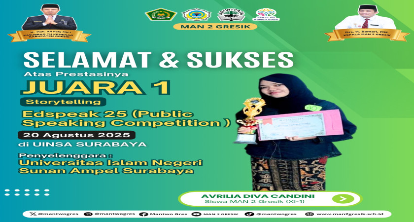 Prestasi membanggakan kembali ditorehkan oleh siswa MAN 2 Gresik. Avrillia Diva Candini, siswi kelas XI-1, berhasil meraih Juara 1 kategori Storytelling dalam ajang Edspeak 25 (Public Speaking Competition) yang diselenggarakan pada 20 Agustus 2025 di Universitas Islam Negeri Sunan Ampel (UINSA) Surabaya.
