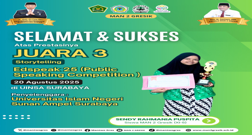 MAN 2 Gresik kembali menorehkan prestasi di ajang public speaking. Kali ini, Sendy Rahmania Puspita, siswi kelas XI-5, berhasil meraih Juara 3 kategori Storytelling dalam kompetisi Edspeak 25 (Public Speaking Competition) yang diselenggarakan pada 20 Agustus 2025 di Universitas Islam Negeri Sunan Ampel (UINSA) Surabaya.